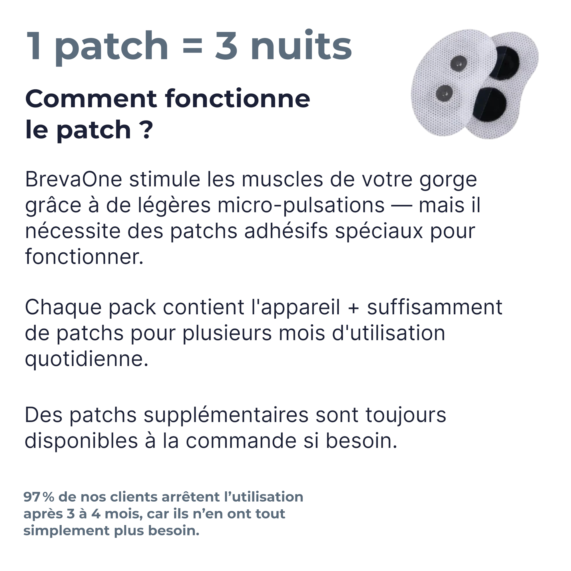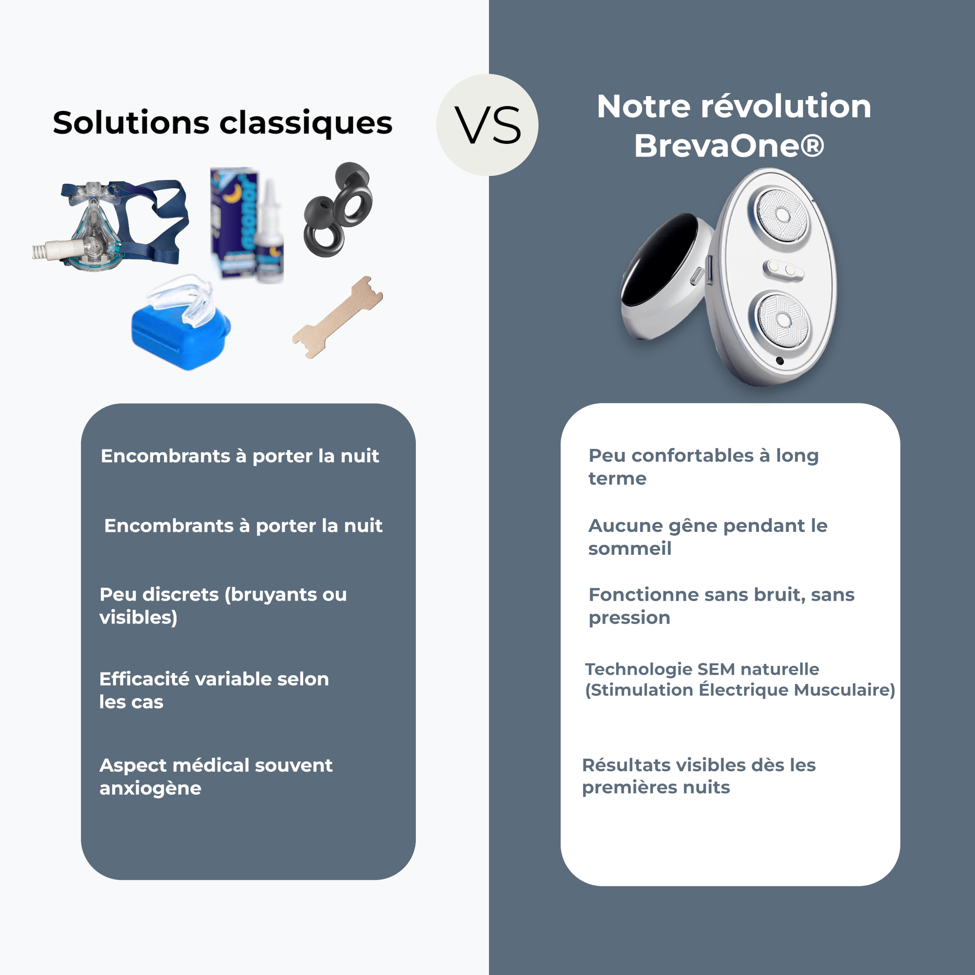 Contrairement aux appareils encombrants ou aux traitements temporaires, BrevaOne™ s’attaque directement à la cause de l’apnée du sommeil : le relâchement musculaire.
