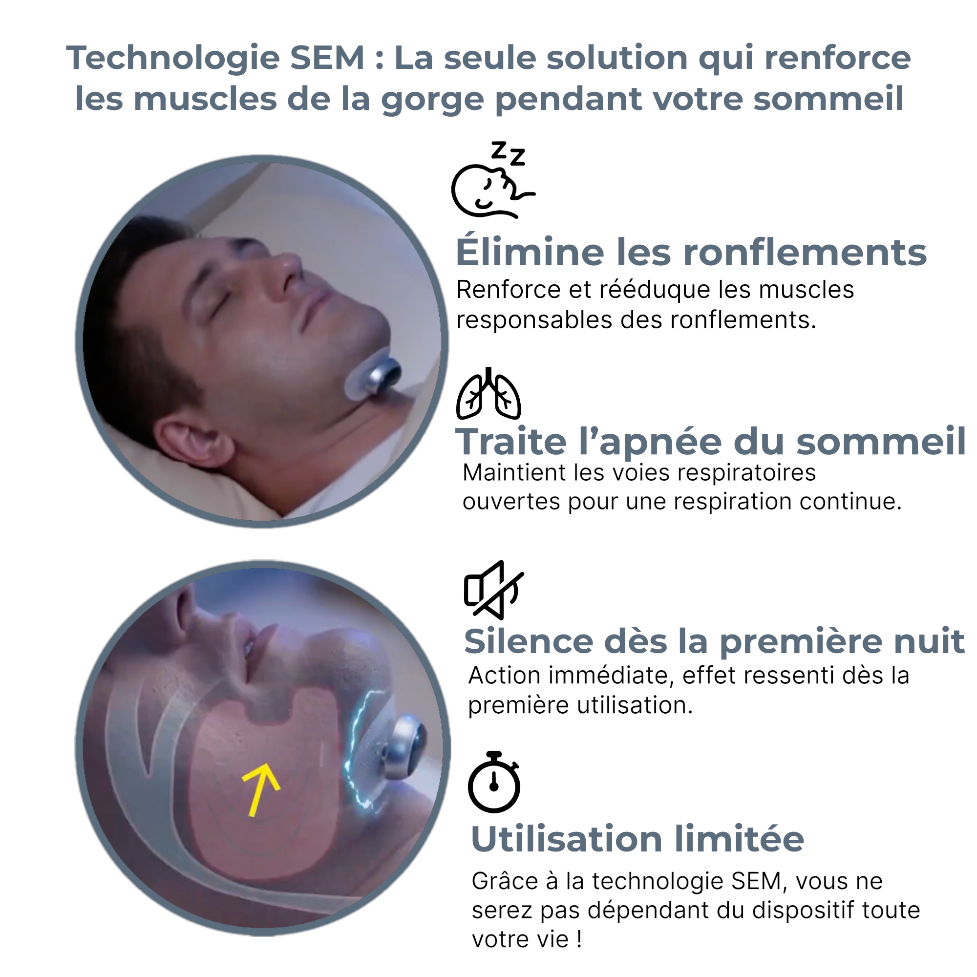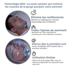 Grâce à la nouvelle technologie SEM, BrevaOne® rééduque en douceur les muscles de votre gorge responsables des ronflements et des micro-apnées, réduisant jusqu’à 93 % des épisodes dès les premières nuits, sans bruit, sans masque, et sans gêne.