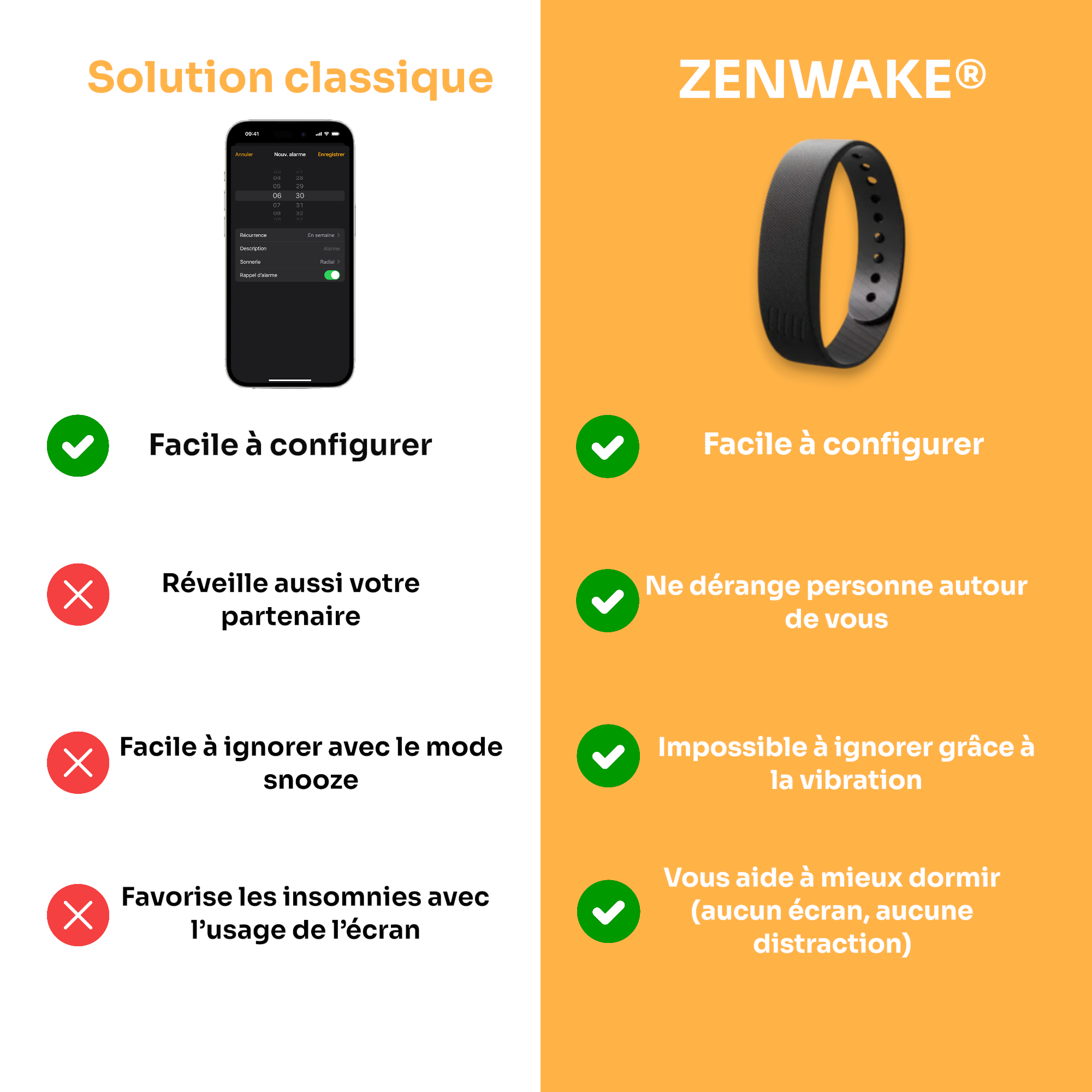 Non. Zenwake® vibre uniquement sur votre poignet — sans bruit, sans lumière, sans onde.