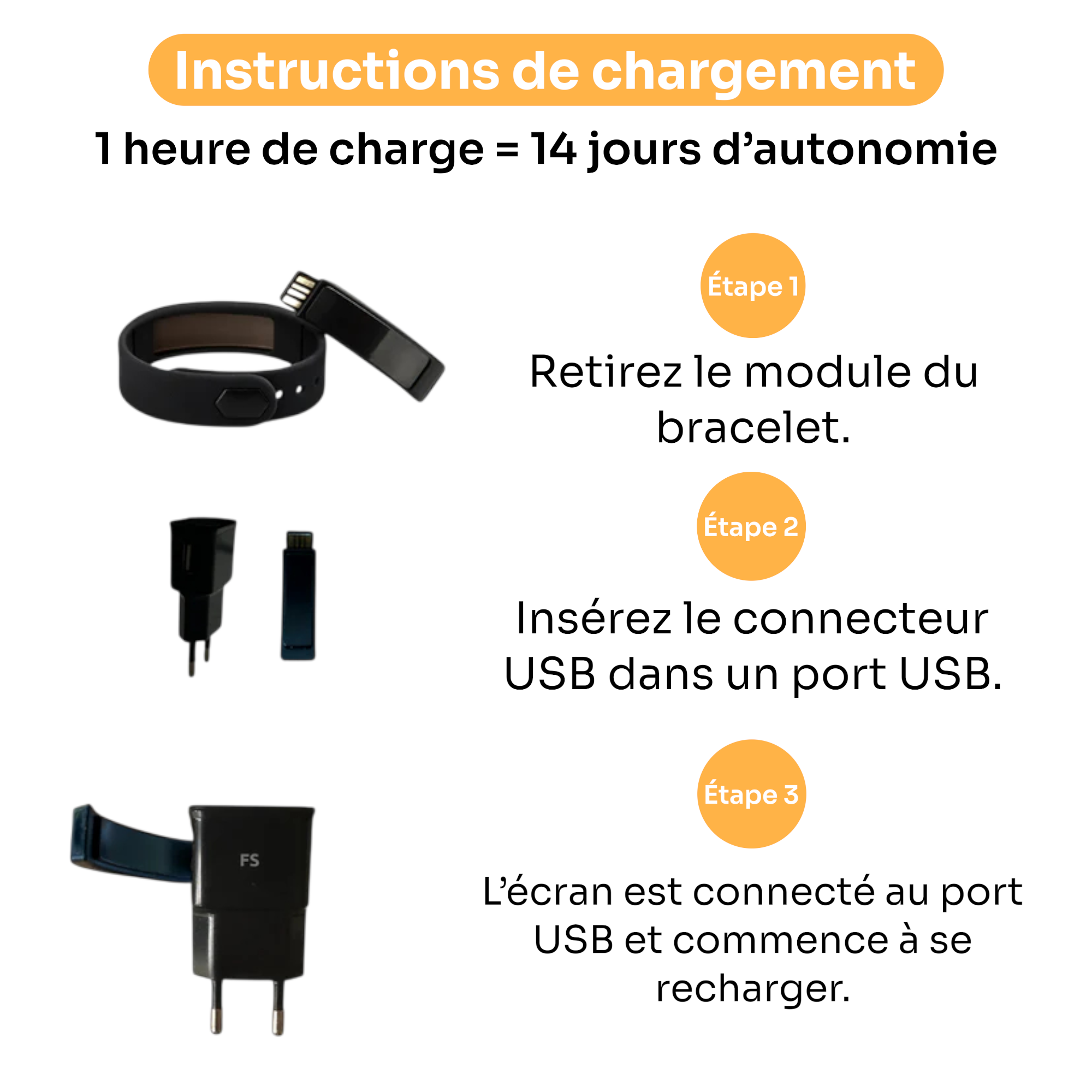(Veuillez noter qu'aucun câble USB n’est inclus. Le bracelet se recharge simplement sur n’importe quel port USB standard : prise de charge iPhone, adaptateur mural, ordinateur portable, etc.)