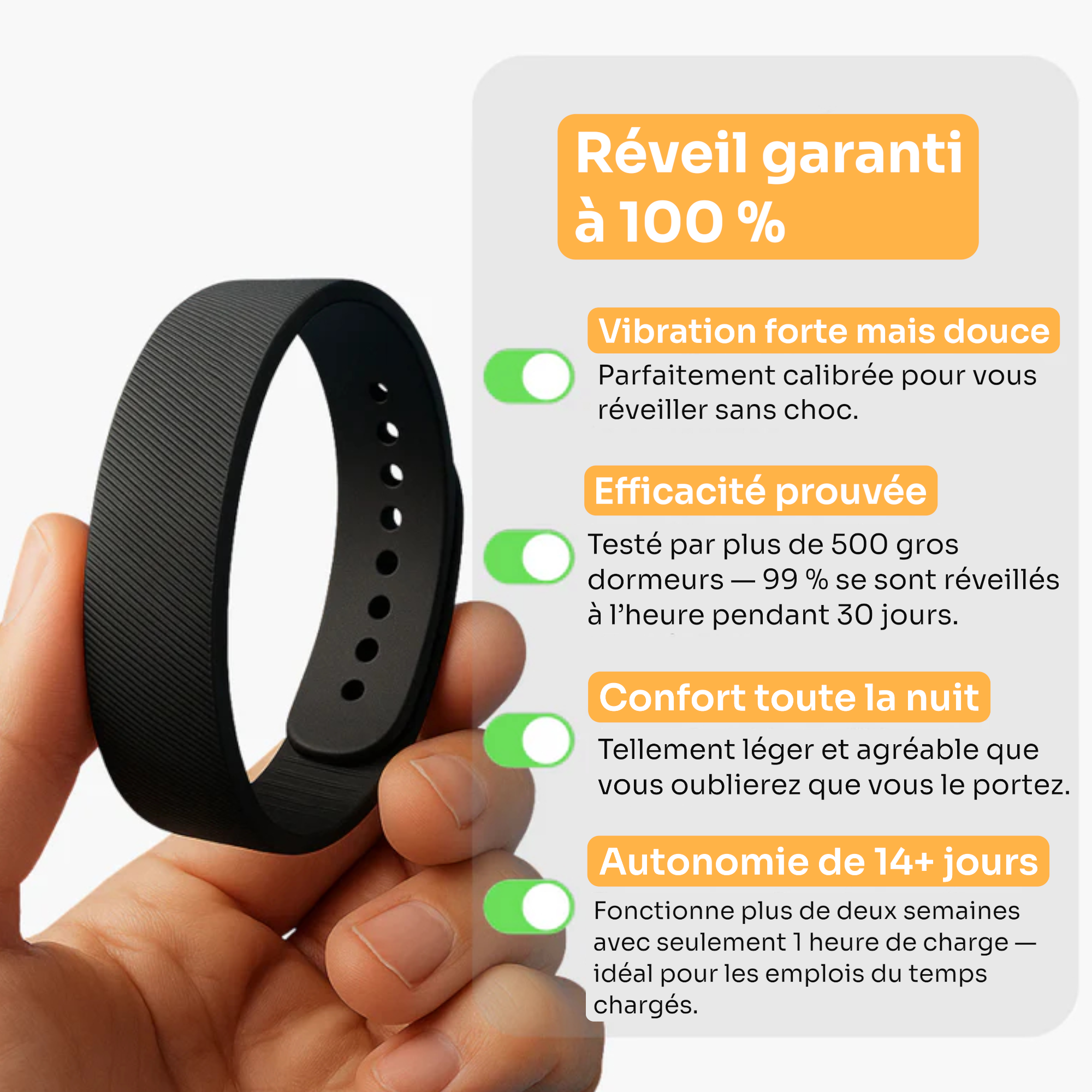 Selon nos enquêtes, plus de 90 % des utilisateurs se lèvent à l’heure, sans snoozer, sans se rendormir.